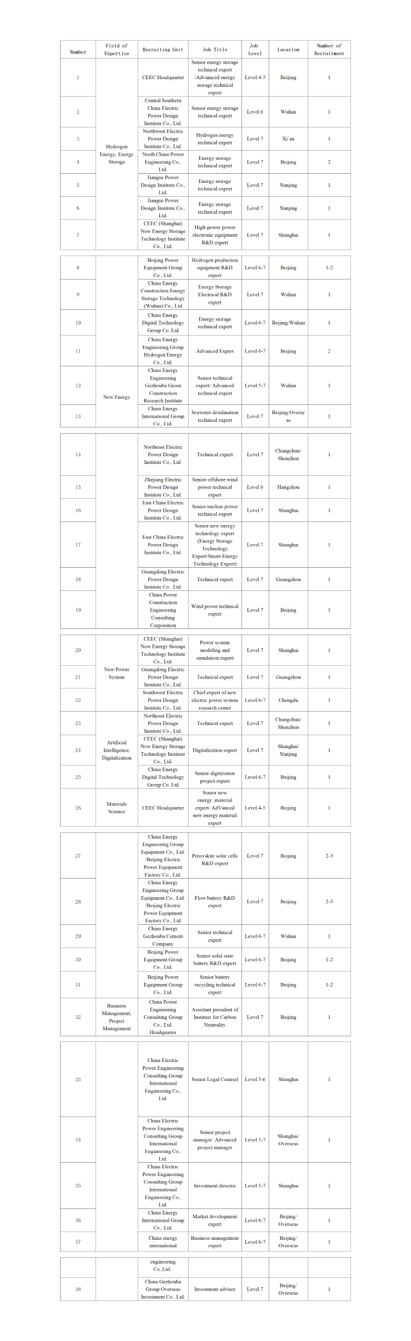 11 | 中能建氫能源有限公司 | 高級專家 | 6級-7級 | 北京 | 2人 | |