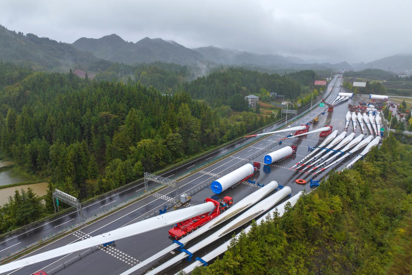 在石柱縣號稱“風電天路”的掛壁公路上,特種專用運輸車就像“朝圣的鋼鐵巨獸”,在盤山路上緩慢而堅定地前行,前后相伴的裝載機組成了向山頂“朝圣”的車隊。從山底貨場到吊裝平臺需要爬過20多公里的盤山路,每當葉片完成轉彎處的“極限超越”時,那種默契而莊重的“神圣儀式感”便會在運輸指揮員與司機心中油然而生。