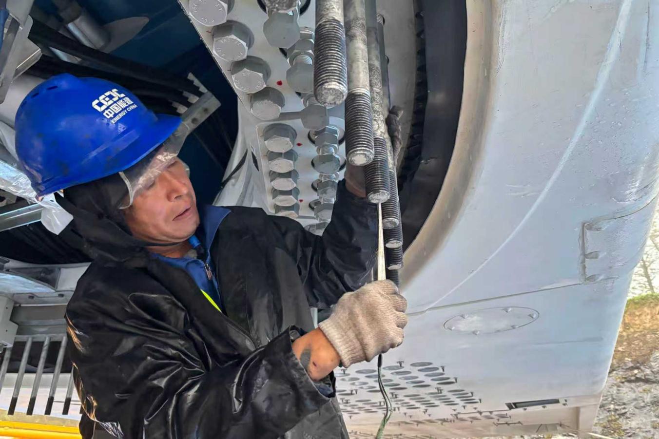 10月12日,天氣稍有好轉,團隊爭分奪秒,一鼓作氣完成第3、4、5節塔筒的吊裝,風機塔筒就此全線貫通,當時已是雨夜23時。